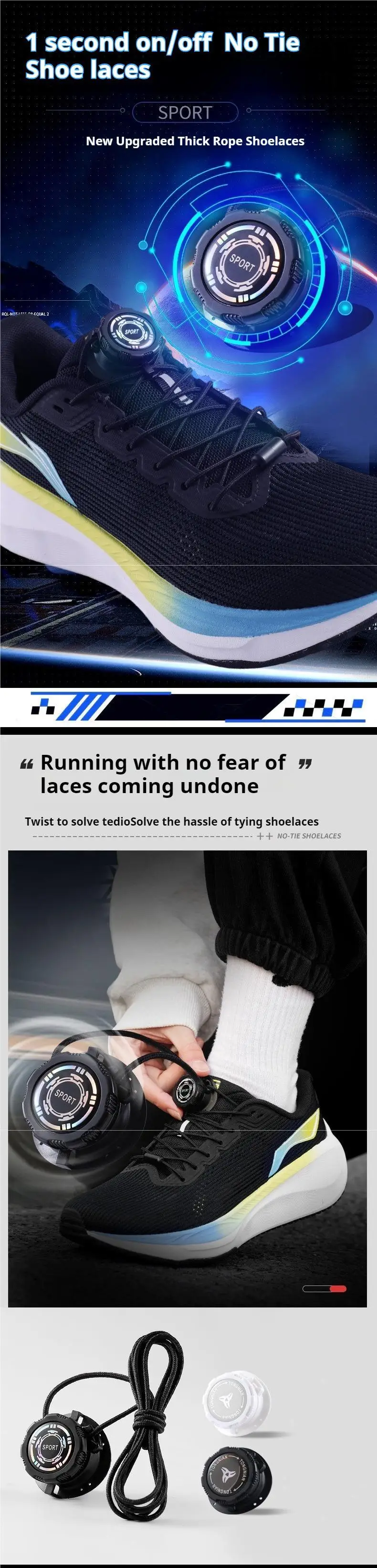 1.Quick to put on and take off: the swivel buckle shoelace adopts innovative tying and untying technology, which allows you to get rid of the tedious shoelace tying steps and easily put on and take off your shoes, especially suitable for children, seniors and athletes, etc.