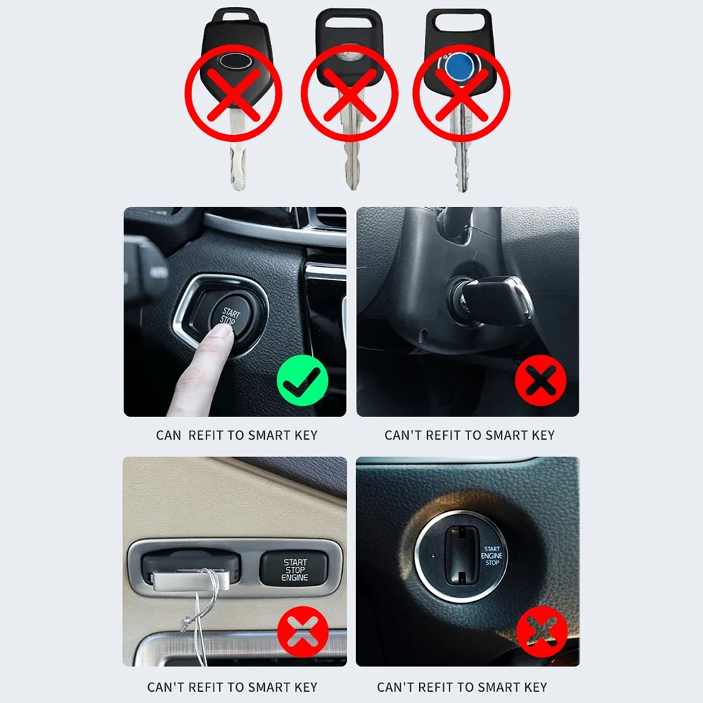 5. Compatibility and Requirements: Designed for vehicles with push-start functionality, the comfortable keyless entry auto lock is not suitable for manual insert car keys. Ensure your car has a key start/stop engine button before purchase, and consider sending a photo of your original key for confirmation.