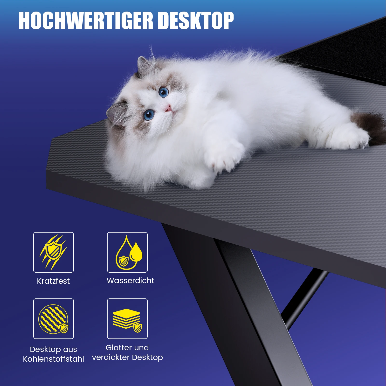 [Stable Z-shaped design]: The lines of the table legs of this gaming desk break with the traditional shape, and the unique Z-shaped legs add a touch of technology to your life. Made of high quality steel, it is more stable and robust and can easily carry up to 80 kg.