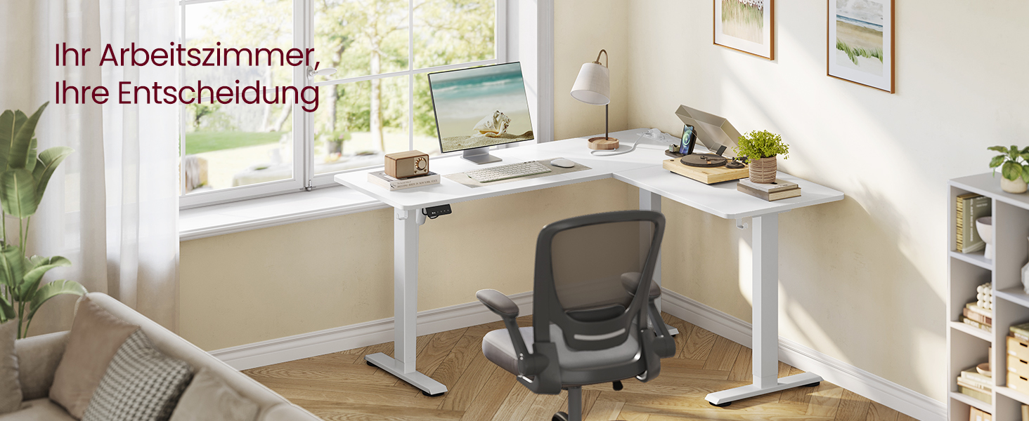 L-shaped design: The L-shaped height-adjustable desk fits perfectly in corners, which not only makes the most of the space, but also creates a spacious work area-ideal for study or office