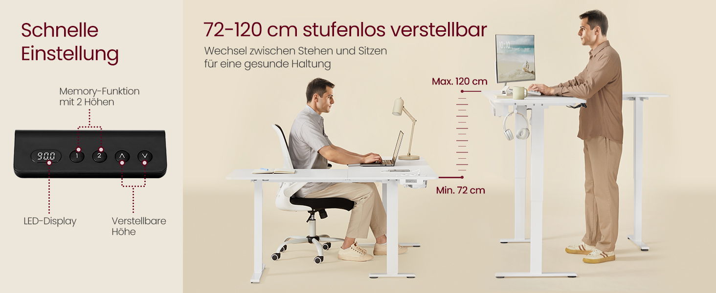 Work comfortably, stay healthy: The table is height adjustable between 72-120 cm, which enables alternation between sitting and standing and thus reduces fatigue when sitting for a long time; the memory function with 2 Heights facilitates the quick setting