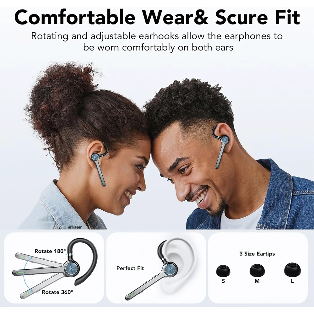The bluetooth earpiece features an ergonomic design with rotating ear hooks and a flip-up microphone, allowing easy switching between left and right ears. It comes with three sizes of earplugs to evenly distribute pressure, ensuring a secure and comfortable fit for all-day wear while minimizing fatigue. Ideal for drivers and business professionals, it also boasts an IP7 waterproof rating, effectively resisting sweat, rain, and other liquids.