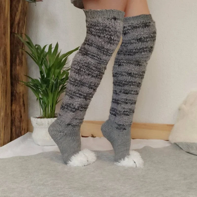 Women Winter Knee High Socks Striped Patchwork Cat Paw Sock Fleece Warm Boot Socks Leg Warmer High Socks for Girls Stocking
